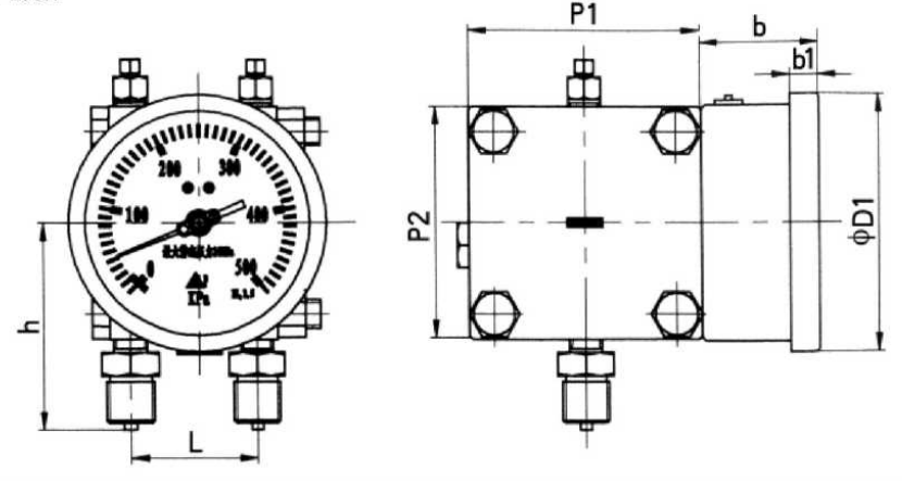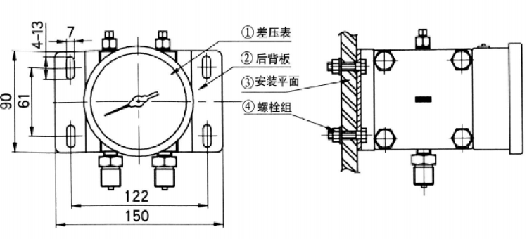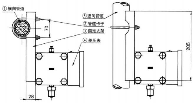 5、 差壓表有后背板式安裝(如圖)和立管固定方法。(管卡子卡到管子上)